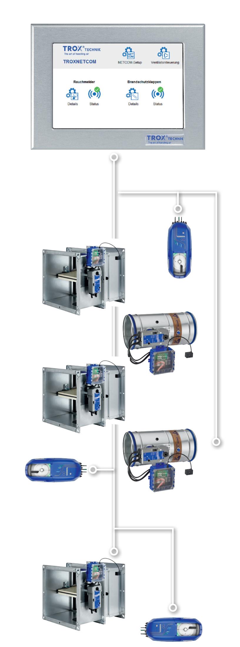 TROXNETCOM is a dedicated control system for complex fire protection equipment in buildings. All the safety-related information for fire protection and smoke extract is read and controlled via one central interface. TROXNETCOM makes use of an advanced network architecture to check all the connected components and to forward data immediately to the relevant points, e.g. to the central fire alarm system. Regular functional tests are carried out and documented to ensure that all components and systems function reliably in the event of a fire. Standard interfaces such as BACnet or Modbus enable the exchange of data among all building services and with the central BMS.